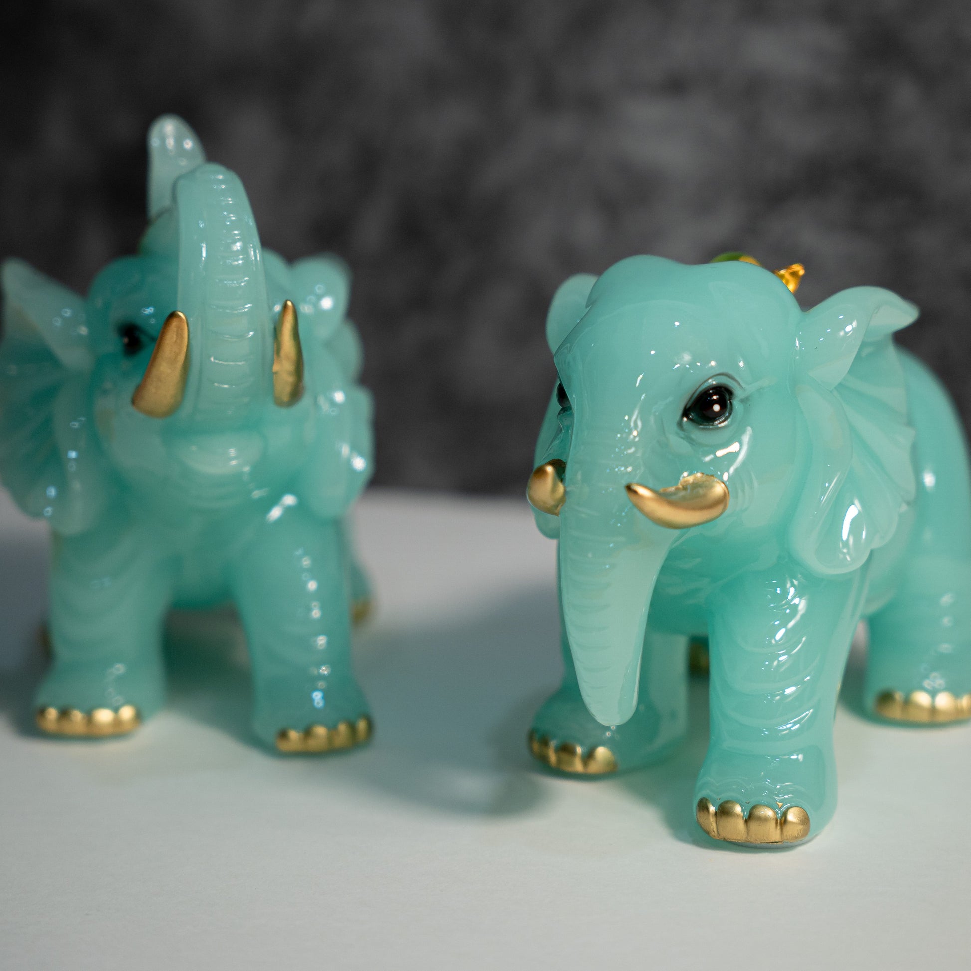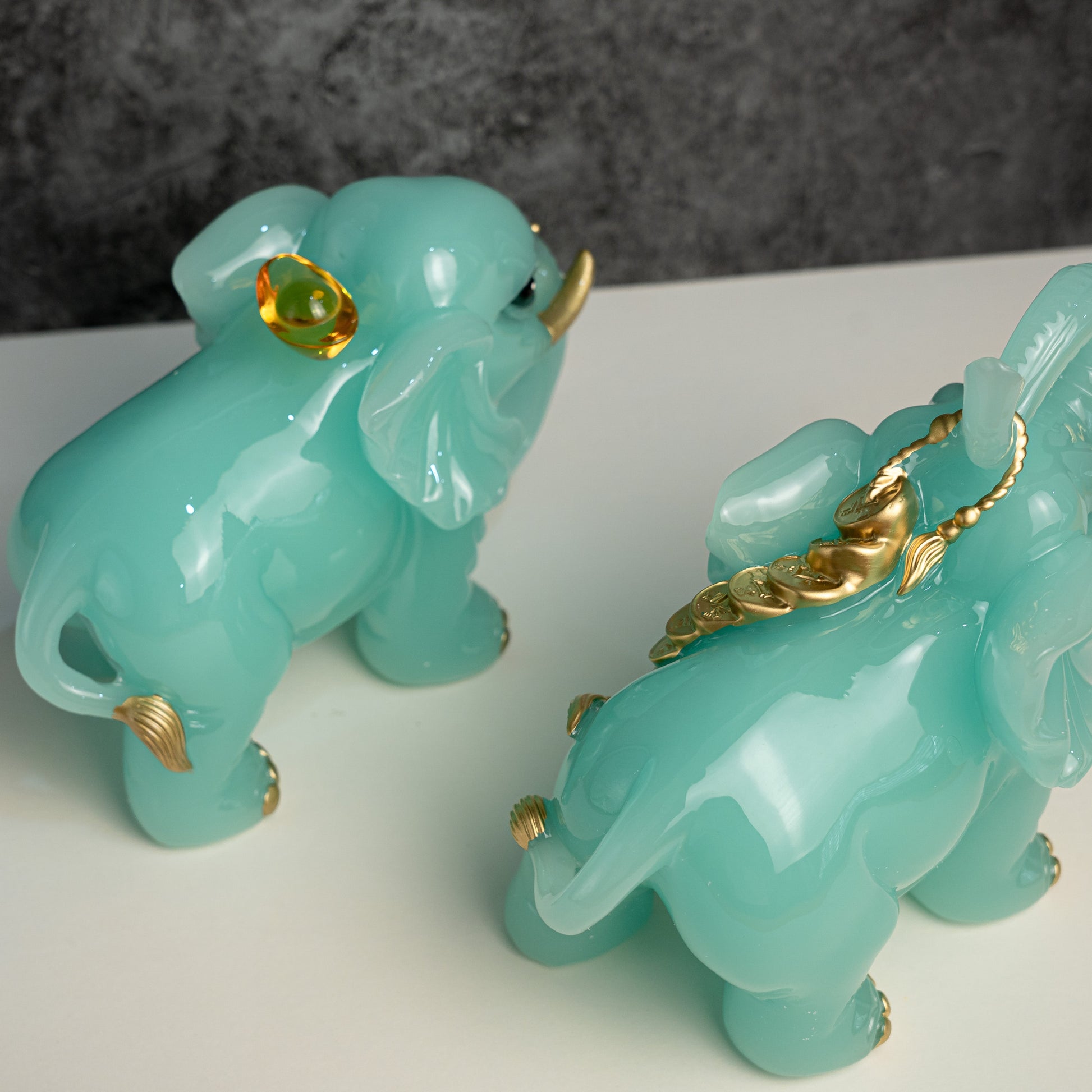 A graceful pair of ceramic jade elephants symbolizing wealth, luck, and positive energy.