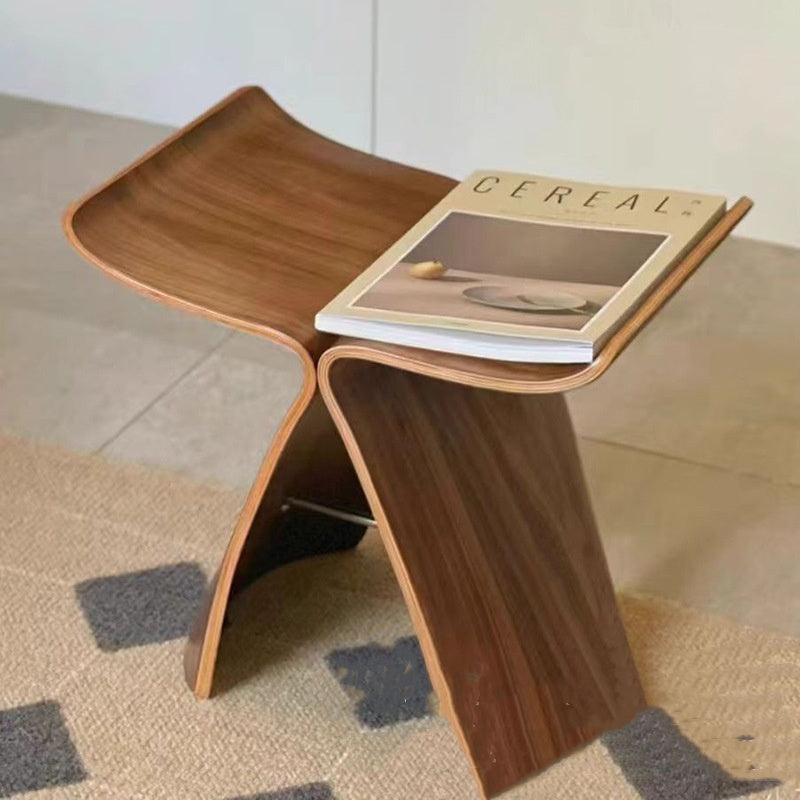 Elegant curved wooden stool blending Scandinavian charm and function, perfect as a seat or decor accent in any space.