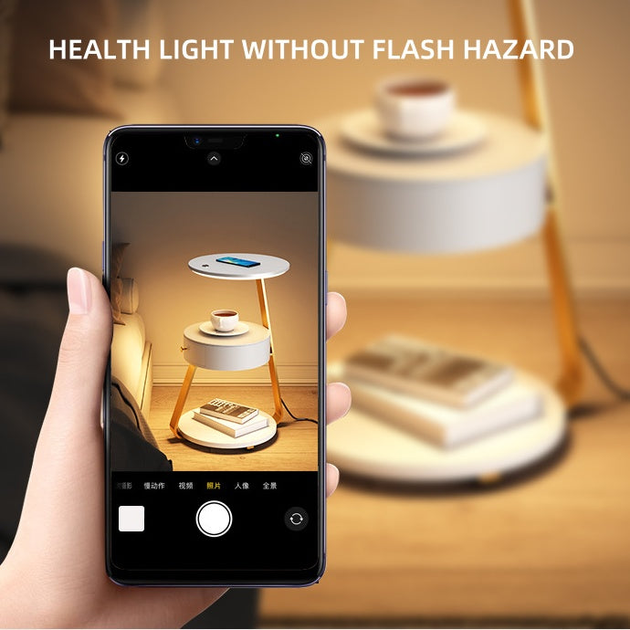 A modern floor lamp combining luxury design with wireless charging and shelf storage, perfect for stylish and functional living spaces.