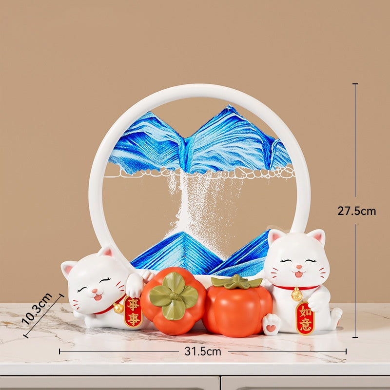 A modern lucky cat sculpture with flowing sand, symbolizing fortune and elegance while adding charm to refined living spaces.
